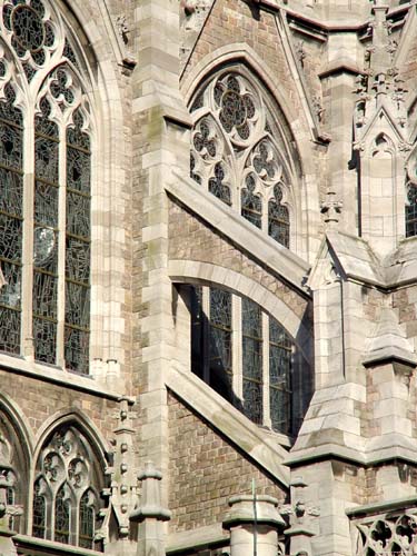 Cette église de style Néo Gothique remplaçait sa prédeseur , qui avait brûlée en 1896. De cette ancienne église, il nous reste la tour, 'Peperbusse'. La nouvelle église est contruite de en pierre calcaire des environnements de Namur, selon ples plans de l'architecte Delacenserie. Elle fait penser à la Notre Dame de Paris, mais ici avec des flèches de tour finies, couronnées par des fleurons, et les côtes sont ornies de crochets. La croisée porte une tour centrale. Près de la croisée, les murs sont supportés par des contreforts et des arc-boutants.