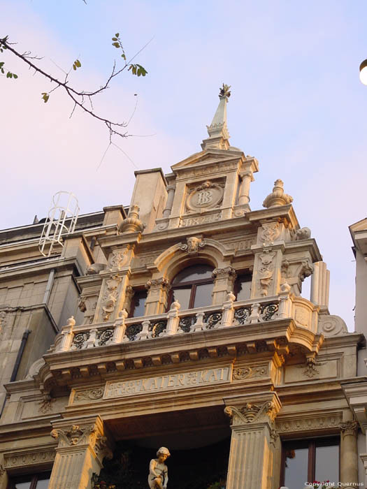 Deze gevel, ontworpen door Hendrik Beyaert, is een mengeling van neorenaissance met neobarok.