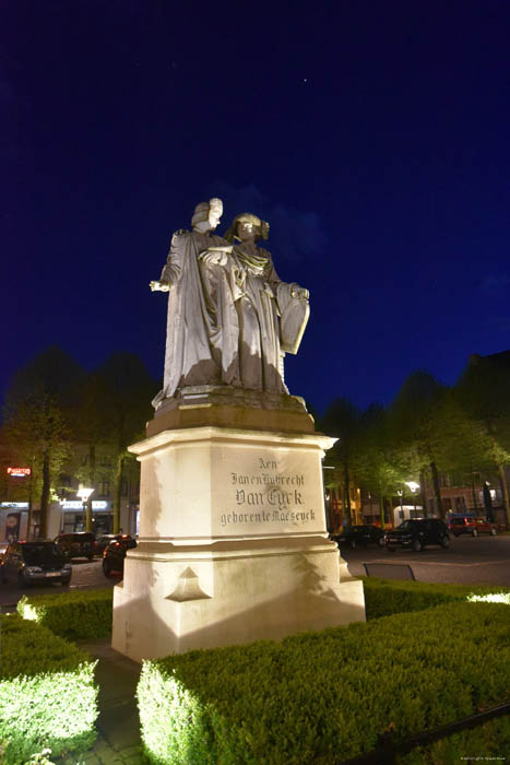 Koning Leopold I huldigde dit standbeeld van Jan & Hubert van Eyck in op 5 september 1864. Deze beroemde schilders waren afkomstig uit Maaseik. Frits Schetsken: 'In de zestiger jaren van de 19de eeuw wil men in Maaseik zoals elders in het jonge koninkrijk België een beeld oprichten van een historische figuur die het nationale gevoel kan belichamen. Maaseik kiest voor de gebroeders Van Eyck, de vijftiende-eeuwse schilders, waarvan vooral Jan ook buiten België bekend is geworden, omdat hij zowel voor prinsbisschop Jan van Beieren als voor hertog Filips de Goede heeft gewerkt. Van Hubert – of Huibrecht, zoals hij zeer Vlaams op het standbeeld staat vermeld – is weinig geweten en hij is ook vroeger gestorven als zijn broer, namelijk in 1426, terwijl Jan het leven pas voor bekeken hield in 1441. Het Gentse drieluik ‘Het Lam Gods’ wordt beschouwd als een gezamenlijke prestatie, waaraan Hubert is begonnen en dat door Jan is voltooid in 1432. Bij het grote publiek is het meesterwerk vooral bekend geworden door de diefstal op 11 april 1934 van twee panelen, de Rechtvaardige Rechters en de grisaille van Johannes de Doper, welke laatste werd terugbezorgd als bewijs dat de losgeldeiser wel degelijk in het bezit was van het eerste paneel. Nu kende Maaseik in de negentiende eeuw twee politieke stromingen, katholieken en liberalen. Die raakten het niet eens over de plaats van het beeld. De katholieken wilden het midden op de Markt hebben, maar dan moest een grote eik worden gekapt, die als stadssymbool gold: ‘Vast als Eyck by der Mase’. De liberalen wilden de boom sparen en het beeld aan de zijkant plaatsen. De ruzie sleepte aan totdat de Brusselse overheid liet weten dat er enkel staatssubsidie voor het beeld zou komen als er een akkoord was over de plaatskeuze. Dat hielp, binnen de kortste keren raakten beide partijen het eens over de centrale plek op het plein en de raadzaal van het gemeentehuis kreeg nieuwe stoelen, gemaakt uit het hout van de gekapte eik. De in Venlo geboren, maar in Brussel getogen beeldhouwer Leopold Wiener kon toen aan het werk en kapte de gebroeders Van Eyck uit carraramarmer, zodat op 5 september 1864 koning Leopold I het beeld kon onthullen. Er is ook lang geredetwist over de geboorteplaats van de gebroeders Van Eyck en hun eventuele zuster Margaretha, die volgens sommigen bronnen ook nog een handje toegestoken zou hebben bij het Lam Gods. Er zijn enkele argumenten die de keuze naar Maaseik hebben doen overhellen en niet naar het Vlaams-Brabantse Jezus-Eik of het Nederlandse Bergeyck in de provincie Noord-Brabant. Maaseik behoorde in vroeger eeuwen namelijk tot het prinsbisdom Luik en daar kwam de voornaam Hubert veel voor, naar bisschop Hubertus. In sommige aan Jan toegeschreven geschriften komt in plaats van het woordje ‘ik’ het woord ‘ich’ voor, wat in het Limburgs dialect nog steeds gebruikelijk is. Lievine, een dochter van Jan, is geboren in Brugge maar treedt in het klooster in het verre Maaseik, hetgeen op familiebanden aldaar lijkt te wijzen. Maar in Maaseik twijfelt uiteraard niemand eraan: Jan en Hubert zijn van hen!'